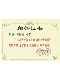 • 江蘇省改革開放40周年十大影響力品牌人物-胡德霖(獎狀)